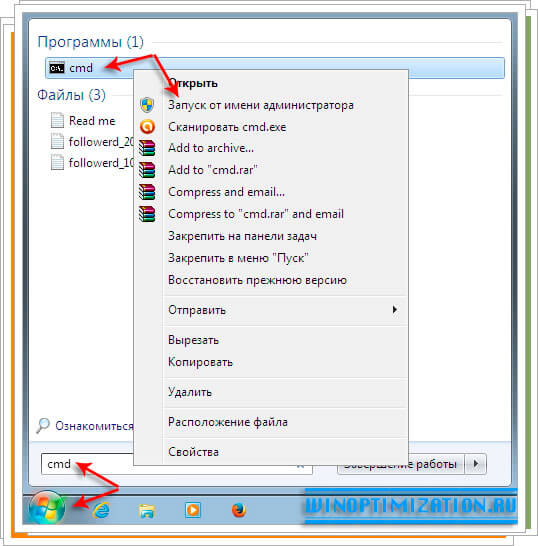 Первое. Чтобы запустить утилиту Power Configuration для создания ею отчета об электропотреблении ноутбука щелкните по кнопке “Пуск” и в открывшемся основном меню Windows 7, в его поисковой строке наберите команду “cmd”. В результатах поиска щелкните правой клавший мыши по соответствующему значку программы и в контекстном меню выберите пункт “Запуск от имени Администратора”.