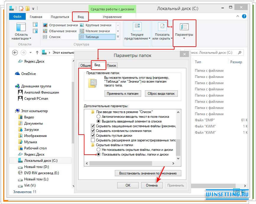 Итак, скачайте необходимые папки с “сейвами” игры на флэшку. Обычно эти папки находятся в директории ProgramData, и носят название самой игры или разработчика. Если вы не можете обнаружить необходимые папки, то проверьте, включена ли у вас функция отображения в проводнике скрытых и системных папок и файлов. Если нет, обязательно включите ее. Делается это следующим образом: откройте Проводник, затем щелкните по “Вид”, затем по “Параметры”, перейдите в новом диалоговом окне “Параметры папок” во вкладку “Вид” и активируйте радиокнопку “Показывать скрытые папки, файлы и диски” (см. рисунок ниже).