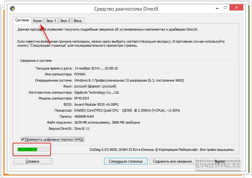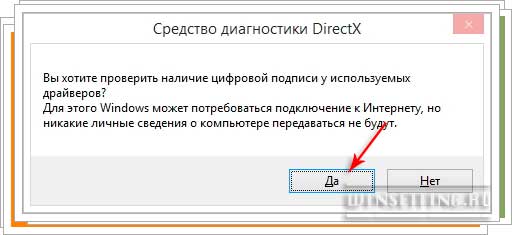 - На вашем экране появится сообщение утилиты “Средство диагностики DirectX”, где вам будет предложено выполнить проверку цифровой подписи у используемых драйверов.
