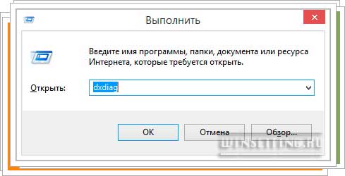 - Нажмите у себя на клавиатуре сочетание клавиш “Win+R”. В открывшемся окне “Выполнить” введите команду “dxdiag” и щелкните по клавише “Enter”.