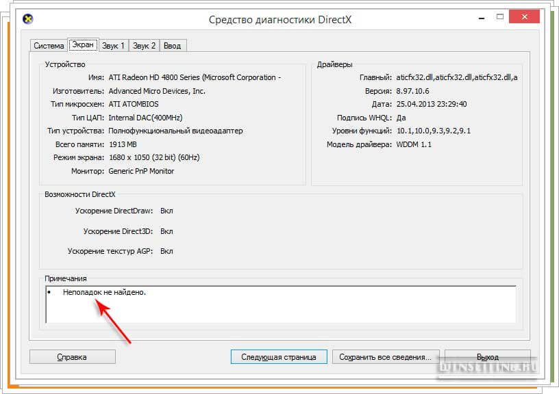 - Если во вкладке “Экран”, в низу, в поле “Примечание” вы увидите список ошибок, это будет говорить о том, что их необходимо устранить, чтобы видеокарта работала без сбоев. При этом не стоит забывать один важный момент: в этом поле ошибок может и не быть!