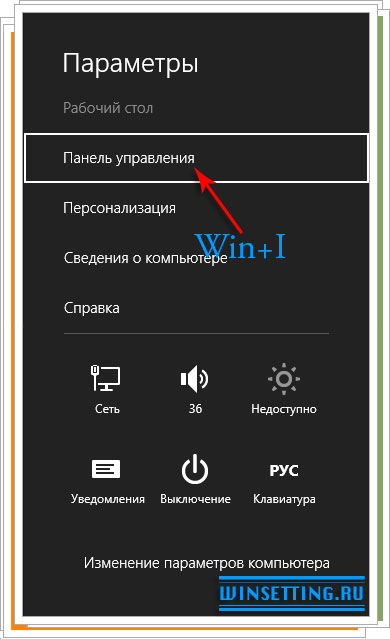 - Нажмите у себя на клавиатуре комбинацию клавиш “Win” + “I”, чтобы открыть боковую панель Windows 8. Затем, в появившейся панели кликните по пункту “Панель управления”. Или откройте панель управления системой любым удобным для вас способом.