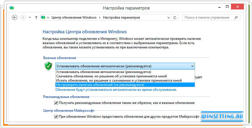 - В открывшемся окне “Цент обновлений Windows” в левой его части кликните по ссылке “Настройка параметров”, после чего в разделе “Важные обновления” в выпадающем списке выберите “Не проверять наличие обновлений” и щелкните по “Ok”.