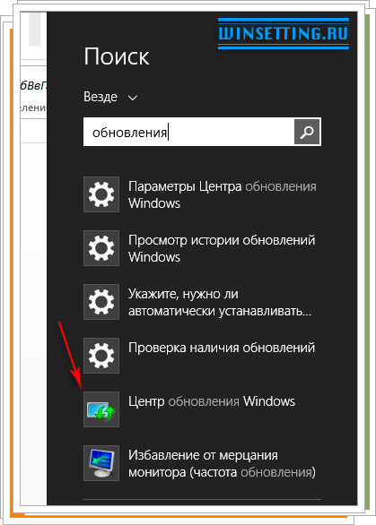 - Первое, что нужно сделать в данной ситуации – это отключить функцию автоматической установки обновлений Windows 8. Для этого нажмите у себя на клавиатуре сочетание клавиш “Win” + “C” и в появившейся чудо панели кликните по “Поиск”. В поисковой строке введите “обновления” и в результатах поиска щелкните по пункту “Центр обновлений Windows”.
