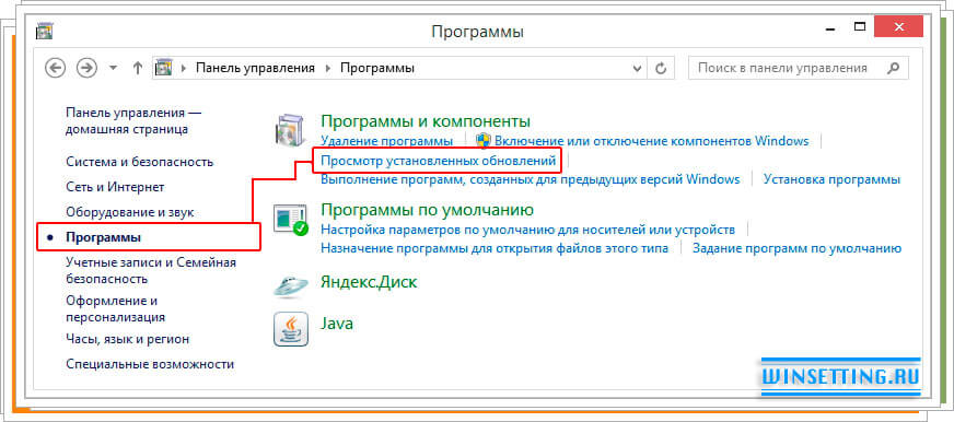 - Щелкните правой левой клавишей мыши по разделу “Программы”, а во вновь открывшемся диалоговом окне перейдите по ссылке “Просмотр установленных обновлений”.