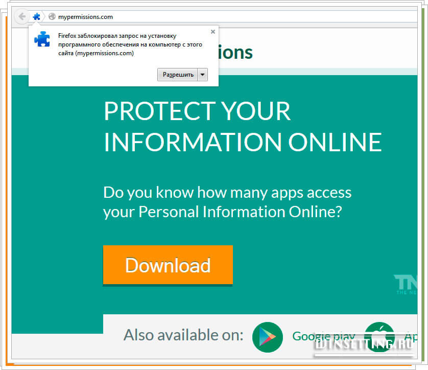 Так как MyPermissions работает как расширение для браузеров Firefox, Chrome, Opera и Safari, его нужно установить для использования. Для этого в адресной строке вашего веб-обозревателя введите адрес mypermissions.com, чтобы перейти на сайт расширения для его загрузки. На открывшемся сайте щелкните по большой желтой кнопке “Download” и затем во сплывающем диалоговом окне по “Разрешить”.