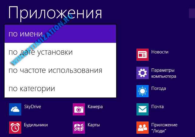 Помимо улучшения функциональности плиток начального экрана, на нем появилась дополнительная кнопка (изображенная в виде стрелки в кружочке направленной вниз). Нажатие на эту кнопку приводит к тому, что на экране появляются пиктограммы всех установленных на компьютере программ. Что касается полного списка приложений, то в Windows 8.1 он получил функцию сортировки по нескольким критериям: по имени, по дате, по частоте использования и по категориям.