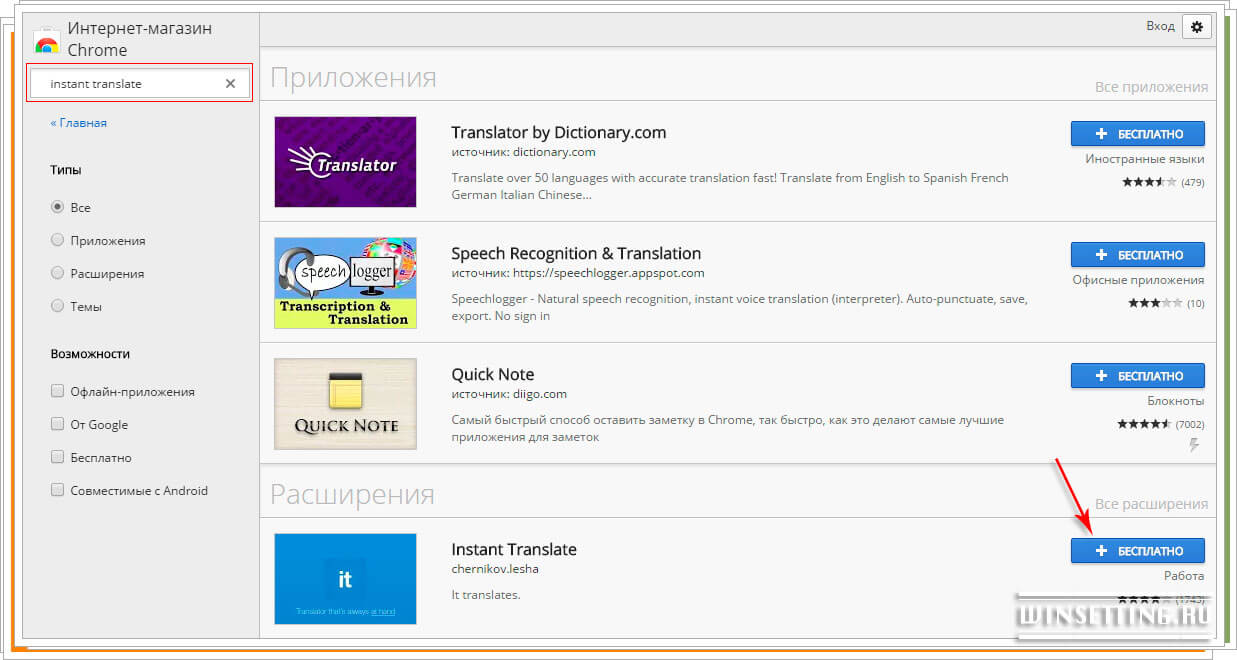 После того, как откроется интернет-магазин, в верхней его части слева введите в поисковую строку название расширения (instant translate), чтобы найти его. Далее в результатах поиска кликните по кнопке “+ Бесплатно”, расположенной правее названия расширения, выполняющего автоматический перевод сайтов.