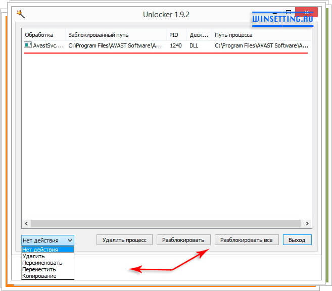 В появившемся диалоговом окне программы вы увидите все процессы и приложения, которые блокируют данный файл или папку. Чтобы выполнить разблокировку достаточно нажать в этом окне на кнопку “Разблокировать все”, или же выбрать необходимое действие (например, удаление), щелкнув по раскрывающемуся списку слева снизу (см. рисунок).