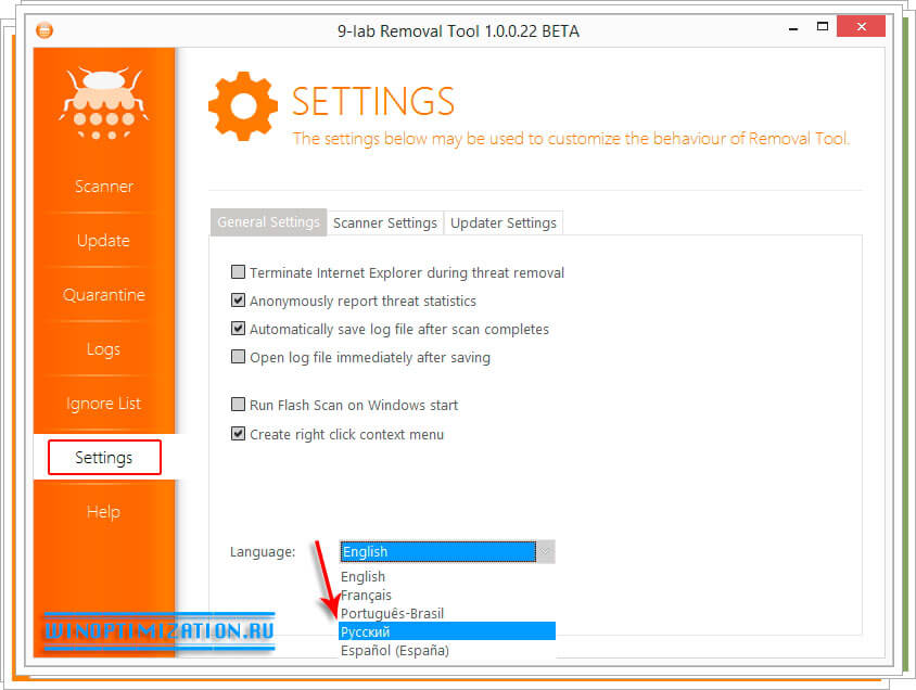 Настройка утилиты 9-Lab Removal Tool и сканирование системы