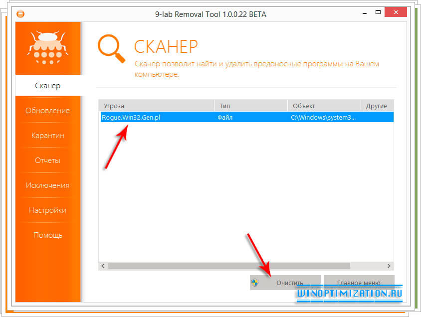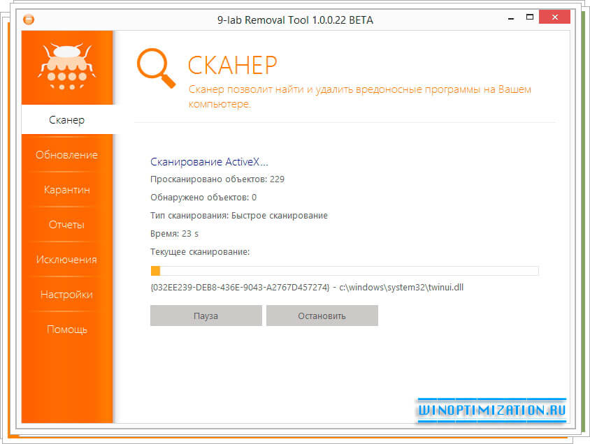 9-Lab Removal Tool – абсолютно бесплатная утилита выполняющая роль антивирусного сканера. Приложение не конфликтует с другими установленными в систему антивирусными программами и на профессиональном уровне находит зараженные объекты, такие как трояны, зараженные ключи реестра, вирусы и тп.