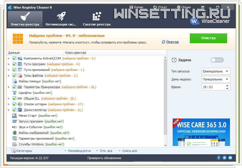Основным отличием программы Wise Registry Cleaner от аналогичных является то, что она может выполнять проверку реестра автоматически по расписанию.